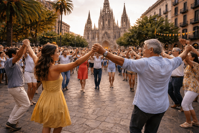 Во время прогулок по улицам или при посещении культурных заведений легко натолкнуться на каталонские танцы. Участвующие образуют круг, берут друг друга за руки, подымают их и начинают в размеренном темпе водить хоровод.